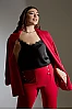 Σετ κοστούμι από ελαστικό ύφασμα αποτελούμενο από ένα χαλαρό blazer και ψηλόμεσο παντελόνι . Τα μανίκια είναι με μανσέτες γυρισμένες και διακοσμημένα με χρυσό κουμπί προσθέτοντας μια πινελιά πολυτελείας. Το παντελόνι είναι σε κλασική ίσια γραμμή , προσφέροντας κομψότητα και κατάλληλο για διαφορετικούς σωματότυπους. Έχει ψηλή μέση, η οποία τονίζει τη σιλουέτα .Στη μέση διαθέτει τρία χρυσά κουμπιά από κάθε μεριά που συνδυάζονται με εκείνα στο σακάκι, προσφέροντας οπτική συνοχή στο σύνολο.