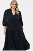 Κομψό και αέρινο midi φόρεμα σε μαύρη απόχρωση. Διαθέτει χαλαρή γραμμή που αγκαλιάζει το σώμα με άνεση, ενώ τα διακριτικά βολάν προσθέτουν κίνηση και θηλυκότητα.